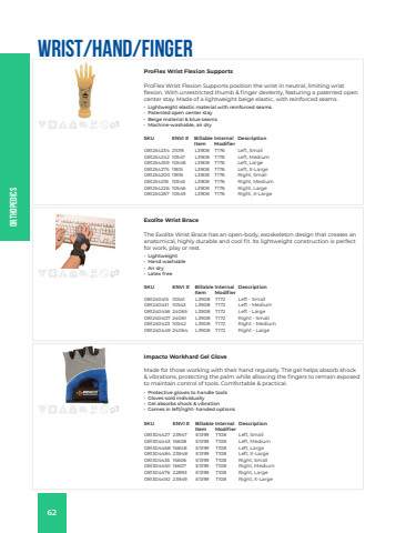 OrthopedicsWrist/Hand/FingerProFlex Wrist Flexion SupportsProFlex Wrist Flexion Supports position the wrist in neutral, limiting wrist flexion. With unrestricted thumb & finger dexterity, featuring a patented open center stay. Made of a lightweight beige elastic, with reinforced seams.%u00a0%u2022 Lightweight elastic material with reinforced seams%u2022 Patented open center stay%u2022 Beige material & blue seams%u2022 Machine-washable, air drySKU ENVI # Billable ItemInternal ModifierDescription081254234 21091 L3908 T176 Left, Small081254242 10547 L3908 T176 Left, Medium081254259 10548 L3908 T176 Left, Large081254275 11815 L3908 T176 Left, X-Large081254200 11816 L3908 T176 Right, Small081254218 10545 L3908 T176 Right, Medium081254226 10546 L3908 T176 Right, Large081254267 10549 L3908 T176 Right, X-LargeExolite Wrist BraceThe Exolite Wrist Brace has an open-body, exoskeleton design that creates an anatomical, highly durable and cool fit. Its lightweight construction is perfect for work, play or rest.%u2022 Lightweight%u2022 Hand washable%u2022 Air dry%u2022 Latex freeSKU ENVI # Billable ItemInternal ModifierDescription081240415 10541 L3908 T172 Left - Small081240431 10543 L3908 T172 Left - Medium081240456 24065 L3908 T172 Left - Large081240407 24061 L3908 T172 Right - Small081240423 10542 L3908 T172 Right - Medium081240449 24064 L3908 T172 Right - LargeImpacto Workhard Gel GloveMade for those working with their hand regularly. The gel helps absorb shock & vibrations, protecting the palm while allowing the fingers to remain exposed to maintain control of tools. Comfortable & practical.%u2022 Protective gloves to handle tools%u2022 Gloves sold individually%u2022 Gel absorbs shock & vibration%u2022 Comes in left/right- handed%u00a0optionsSKU ENVI # Billable ItemInternal ModifierDescription081304427 23947 E1399 T108 Left, Small081304443 16608 E1399 T108 Left, Medium081304468 16848 E1399 T108 Left, Large081304484 23948 E1399 T108 Left, X-Large081304435 16606 E1399 T108 Right, Small081304450 16607 E1399 T108 Right, Medium081304476 22893 E1399 T108 Right, Large081304492 23949 E1399 T108 Right, X-Large62