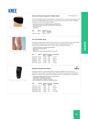 OrthopedicsKneeSammons Preston Neoprene Patellar BandThis black patellar band is designed to help keep the muscles that support the knee on a heightened level of alert. It provides symptomatic relief of patellar tendonitis & chondromalacia patella.%u2022 Good for personal or professional care & treatment%u2022 Neoprene & nylon provides comfortable compression%u2022 One size fits all%u2022 Latex freeSKU ENVI # Billable ItemInternal Modifier081191451 16362 A4467 T109Cho-Pat Patellar StrapProvides symptomatic relief of acute and chronic pain that is often associated with patellar tendonitis and chondromalacia patella syndrome. Not recommended for those with varicose veins crossing the knee.%u2022 Guides kneecap into place and elevates it%u2022 Relieves harmful pressure%u2022 Latex free%u2022 Sizing: Circumfence below patella of up to 10%u201dSKU ENVI # Billable ItemInternal ModifierDescription081349257 22629 A4467 T109 X-Small081191741 10750 A4467 T109 Small081191758 10751 A4467 T109 Medium081191766 10752 A4467 T109 Large081191774 22196 A4467 T109 X-LargeRolyanFit Hinged Knee BraceFeatures a sewn-in universal buttress, hinges molded into the brace to maintain a low profile, & D-ring straps with hook & loop closures to keep the support in place. The neoprene provides warmth, compression, & durability.%u2022 Contoured closed popliteal area for improved fit%u2022 Made of 1/8%u201d neoprene, latex free%u2022 Low profile, pull-on style knee brace%u2022 Soft cushioned liner offers increased comfortSKU ENVI # Billable ItemInternal ModifierDescription081547017 25111 L1820 T114 Small081547033 25112 L1820 T114 Medium081547041 25113 L1820 T114 Large081547058 25114 L1820 T114 X-Large081547066 25115 L1820 T114 XX-Large63