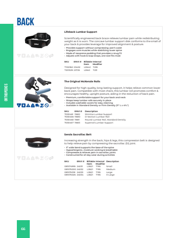 OrthopedicsBackLifeback Lumbar SupportScientifically engineered back brace relieves lumbar pain while redistributing weight as it is worn. The concave lumbar support disk conforms to the small of your back & provides leverage for improved alignment & posture.%u2022 Provides support without compressing user%u2019s waist%u2022 Engages core muscles while stabilizing lower spine%u2022 Made of neoprene padding that provides a snug fit%u2022 Adjusts with hook & loop straps, one size fits mostSKU ENVI # Billable ItemInternal Modifier7102362 23402 L0642 T2357201329 23725 L0641 T231The Original McKenzie RollsDesigned for high-quality, long-lasting support, it helps relieve common lower back pain. Compatible with most chairs, this lumbar roll promotes comfort & encourages healthy, upright posture, aiding in the reduction of back pain.%u2022 Premium, comfortable support for your back and neck%u2022 Straps keep lumbar rolls securely in place%u2022 Includes washable covers for easy cleaning%u2022 Available in Standard Density or Firm Density (11%u2033 L x 4%u00be%u2033)SKU ENVI # Description7030461 11682 Slimline Lumbar Support7030456 11680 D-Section Lumbar Roll7030463 11681 Round Lumbar Roll, Standard Density7030457 11683 Superroll Lumbar SupportSerola Sacroiliac BeltIncreasing strength in the back, hips & legs, this compression belt is designed to help relieve pain by compressing the sacroiliac (SI) joint.%u2022 3%u201d wide band supports the base of the spine%u2022 Hypoallergenic, moisture-wicking & breathable%u2022 Compresses & relieves pain in sacroiliac joints%u2022 Constructed for all day wear during activitiesSKU ENVI # Billable ItemInternal ModifierDescription081574995 24031 L0621 T195 Small081575000 24032 L0621 T195 Medium081575018 24033 L0621 T195 Large081575026 24034 L0621 T195 X-Large66