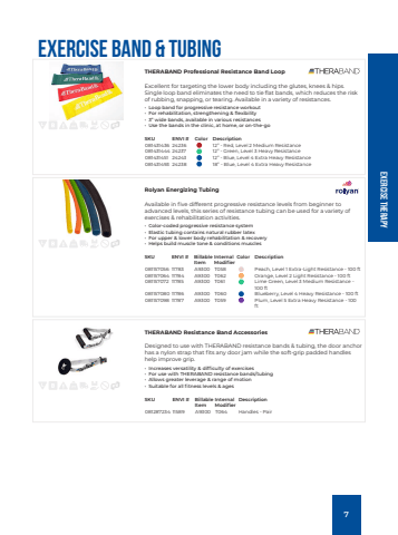 Exercise TherapyExercise Band & TubingTHERABAND Professional Resistance Band Loop %u00aeExcellent for targeting the lower body including the glutes, knees & hips. Single loop band eliminates the need to tie flat bands, which reduces the risk of rubbing, snapping, or tearing. Available in a variety of resistances.%u2022 Loop band for progressive resistance workout%u2022 For rehabilitation, strengthening & flexibility%u2022 3%u201d wide bands, available in various resistances%u2022 Use the bands in the clinic, at home, or on-the-goSKU ENVI # Color Description081431436 24236 12%u201d - Red, Level 2 Medium Resistance081431444 24237 12%u201d - Green, Level 3 Heavy Resistance081431451 24243 12%u201d - Blue, Level 4 Extra Heavy Resistance081431493 24238 18%u201d - Blue, Level 4 Extra Heavy ResistanceRolyan Energizing TubingAvailable in five different progressive resistance levels from beginner to advanced levels, this series of resistance tubing can be used for a variety of exercises & rehabilitation activities.%u2022 Color-coded progressive resistance system%u2022 Elastic tubing contains natural rubber latex%u2022 For upper & lower body rehabilitation & recovery%u2022 Helps build muscle tone & conditions musclesSKU ENVI # Billable ItemInternal ModifierColor Description081157056 11783 A9300 T058 Peach, Level 1 Extra-Light Resistance - 100 ft081157064 11784 A9300 T062 Orange, Level 2 Light Resistance - 100 ft081157072 11785 A9300 T061 Lime Green, Level 3 Medium Resistance - 100 ft081157080 11786 A9300 T060 Blueberry, Level 4 Heavy Resistance - 100 ft081157098 11787 A9300 T059 Plum, Level 5 Extra Heavy Resistance - 100 ftTHERABAND Resistance Band Accessories %u00aeDesigned to use with THERABAND resistance bands & tubing, the door anchor has a nylon strap that fits any door jam while the soft-grip padded handles help improve grip.%u2022 Increases versatility & difficulty of exercises%u2022 For use with THERABAND resistance bands/tubing%u2022 Allows greater leverage & range of motion%u2022 Suitable for all fitness levels & agesSKU ENVI # Billable ItemInternal ModifierDescription081287234 11589 A9300 T064 Handles - Pair7