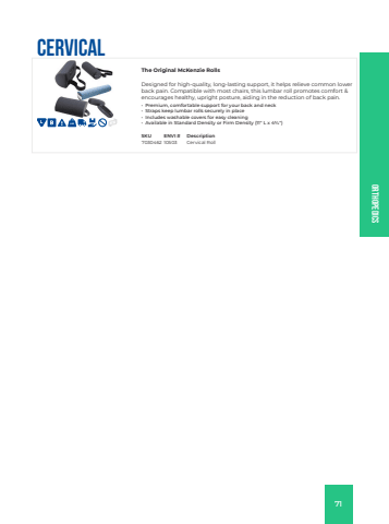 OrthopedicsCervicalThe Original McKenzie RollsDesigned for high-quality, long-lasting support, it helps relieve common lower back pain. Compatible with most chairs, this lumbar roll promotes comfort & encourages healthy, upright posture, aiding in the reduction of back pain.%u2022 Premium, comfortable support for your back and neck%u2022 Straps keep lumbar rolls securely in place%u2022 Includes washable covers for easy cleaning%u2022 Available in Standard Density or Firm Density (11%u2033 L x 4%u00be%u2033)SKU ENVI # Description7030462 10503 Cervical Roll71