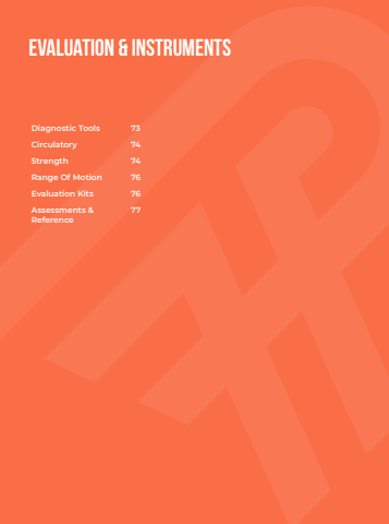 Evaluation & InstrumentsDiagnostic Tools 73Circulatory 74Strength 74Range Of Motion 76Evaluation Kits 76Assessments & Reference77
