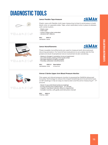 Evaluation & InstrumentsDiagnostic ToolsJamar Flexible Tape MeasurePlastic case with flexible cloth tape measuring inches & centimeters in bold black color on opposite sides. Tape, when extended, locks in place & releases with center button.%u2022 Plastic case%u2022 Cloth tape%u2022 Locks in place when extended%u2022 xtends to 60%u201d (150cm)SKU ENVI #081186915 10509Jamar MonofilamentsThese reusable monofilaments are used to measure both diminishing & returning sensation. For hand & foot evaluations to accurately test for the presence & level of peripheral nerve involvement & skin sensitivity.%u2022 Measure changes in sensation & nerve impairment%u2022 Accurate sensory testing of the hands & feet%u2022 Damage resistant & highly reusable%u2022 Precisely calibrated monofilamentsSKU ENVI # Description081295856 21291 5 Piece KitOmron 3 Series Upper Arm Blood Pressure MonitorThis upper arm blood pressure monitor is powered by OMRON Advanced Accuracy Technology to reduce the impact breathing and movements have on BP readings.%u00a0It has an easy-to-read screen and fits arms measuring 9%u201d - 17%u201d around.%u2022 Stores 14 accurate blood pressure readings%u2022 D-ring cuff fits arms measuring 9%u201d - 17%u201d around%u2022 Irregular Heartbeat Indicator detects irregularities%u2022 Includes monitor, cuff, guide, and instruction manualSKU ENVI #7102754 2381173