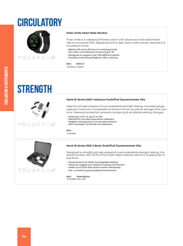 Evaluation & InstrumentsCirculatoryPolar Unite Heart Rate MonitorPolar Unite is a waterproof fitness watch with advanced wrist-based heart rate & connected GPS, displaying time & date, alarm with snooze, stopwatch & countdown timer.%u2022 Battery life up to 50 hours in training mode%u2022 Fits wrist circumference measuring 5%u201d-8%u201d%u2022 Designed to support over 100 different sports%u2022 Provides motivating feedback after trainingSKU ENVI #7201945 24009StrengthMark-10 Series EKE-1 Advance Push/Pull Dynamometer KitsIdeal for job task analysis & musculoskeletal strength testing. Included gauge captures maximum compression & tension forces, as well as average force over time. Password protection prevents tampering & accidental setting changes.%u2022 Measures in lb, oz, kg, N, or kN%u2022 MESURTM Lite data acquisition software%u2022 Padded rectangular & curved attachments%u2022 NIST-traceable certificate of calibrationSKU7100280Mark-10 Series EKE-3 Basic Push/Pull Dynamometer KitsDesigned to simplify job task analysis & musculoskeletal strength testing, the dynamometer with %u00b10.2% of full scale helps measure real time & peak push or pull force.%u2022 Powered by 8.4V NiMH rechargeable battery%u2022 Features rugged anti-rotation locking mechanism%u2022 Holds up to 5,00 data points saved individually%u2022 Flat, curved & square padded attachmentsSKU Description7100288 500 LBF74