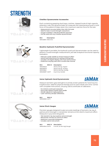 Evaluation & InstrumentsStrengthChatillon Dynamometer AccessoriesEach containing grasping dual loops, notches, clasped hooks & high-capacity extension rods, the dynamometer kit measures the instantaneous push or pull force of the patient & helps retain the maximum exertion force for the test.%u2022 Measurement accuracy better than 0.5% full scale%u2022 Ideal for basic muscle strength evaluations%u2022 Gauges available in 200 lbf & 500 lbf capacities%u2022 Can be used with any Chatillon dynamometerSKU Description081146810 MSCK KitBaseline Hydraulic Push/Pull DynamometerLightweight & portable, the hydraulic push-pull dynamometer can be used to perform muscle strength measurement, job task analysis & functional capacity evaluation.%u2022 Features a peak needle to record maximum effort%u2022 Swivel hook attachment for pulling & lifting tests%u2022 Includes LCD digital display with 5 pre-set functions%u2022 Protective carrying case with a muscle test manualSKU ENVI # Description081228246 250 lb./115 kg. Digital081228279 250 lb./115 kg. Analog081120682 500 lb./225 kg. Analog081228287 24517 Dual Grip HandleJamar Hydraulic Hand DynamometerMeasure isometric grip strength & routinely screen patients for hand trauma & dysfunction. Ideal for physical therapy pros to track rehab over time. Comes with complete instructions, carrying case & certificate of calibration.%u2022 For initial & continued evaluation%u2022 Dual-scale readout & peak-hold needle%u2022 Handle adjusts to 5 grip positions%u2022 1-year warranty (except calibration)SKU ENVI #081028935 24171Jamar Pinch GaugesPrecision gauges designed to give accurate readings of isometric tip, key & palmar pinch strength. A red pointer remains at the client%u2019s maximum effort. Measures in pounds & kilograms.%u2022 Test isometric tip, key & palmar pinch strength%u2022 Red pointer remains at maximum effort%u2022 Measures in pounds & kilograms%u2022 Includes case & instructionsSKU ENVI # Description081543545 24173 0-45 lb. (0-20.4 kg) Gauge75