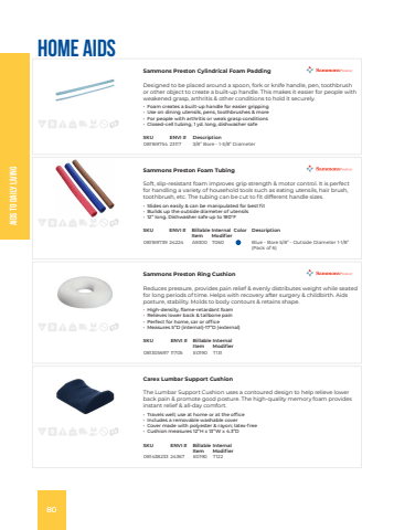 Aids To Daily LivingHome AidsSammons Preston Cylindrical Foam PaddingDesigned to be placed around a spoon, fork or knife handle, pen, toothbrush or other object to create a built-up handle. This makes it easier for people with weakened grasp, arthritis & other conditions to hold it securely.%u2022 Foam creates a built-up handle for easier gripping%u2022 Use on dining utensils, pens, toothbrushes & more%u2022 For people with arthritis or weak grasp conditions%u2022 Closed-cell tubing, 1 yd. long, dishwasher safeSKU ENVI # Description081169754 23117 3/8%u201d Bore - 1-3/8%u201d DiameterSammons Preston Foam TubingSoft, slip-resistant foam improves grip strength & motor control. It is perfect for handling a variety of household tools such as eating utensils, hair brush, toothbrush, etc. The tubing can be cut to fit different handle sizes.%u2022 Slides on easily & can be manipulated for best fit%u2022 Builds up the outside diameter of utensils%u2022 12%u201d long. Dishwasher safe up to 180%u00b0FSKU ENVI # Billable ItemInternal ModifierColor Description081169739 24224 A9300 T060 Blue - Bore 5/8%u201d - Outside Diameter 1-1/8%u201d (Pack of 6)Sammons Preston Ring CushionReduces pressure, provides pain relief & evenly distributes weight while seated for long periods of time. Helps with recovery after surgery & childbirth. Aids posture, stability. Molds to body contours & retains shape.%u2022 High-density, flame-retardant foam%u2022 Relieves lower back & tailbone pain%u2022 Perfect for home, car or office%u2022 Measures 5%u201dD (internal)-17%u201dD (external)SKU ENVI # Billable ItemInternal Modifier081305697 11705 E0190 T131Carex Lumbar Support CushionThe Lumbar Support Cushion uses a contoured design to help relieve lower back pain & promote good posture. The high-quality memory foam provides instant relief & all-day comfort.%u2022 Travels well; use at home or at the office%u2022 Includes a removable washable cover%u2022 Cover made with polyester & rayon; latex-free%u2022 Cushion measures 12%u201dH x 13%u201dW x 4.3%u201dDSKU ENVI # Billable ItemInternal Modifier081438233 24367 E0190 T12280