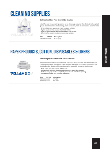 Clinical SuppliesCleaning SuppliesSafetec SaniZide Plus Germicidal SolutionIdeal for use in operating rooms or to clean up around the clinic, this hospital grade disinfectant is fast-acting, non-corrosive, non-flammable & alcohol free.%u2022 EPA registered & approved multi-purpose solution%u2022 Fights bacteria that causes TB, HIV, & MRSA%u2022 Attacks odor-causing microorganisms at the source%u2022 Effective for use on most environmental surfacesSKU ENVI # Description081053537 10495 16 oz SprayPaper Products, Cotton, Disposables & Linens100% Ringspun Cotton Bath & Hand TowelsMeticulously made from premium 100% ringspun cotton, exceptionally soft, highly absorbent, durable, & have a plush feel with long-lasting quality. The dobby border design offers a decorative appeal & prevents shrinkage. %u2022 Each order includes a pack of 12 towels%u2022 Soft & plush feel with excellent absorbency & quick dry solution%u2022 Crafted uniquely for the hospitality market with affordable pricing%u2022 Includes double & lock stitched hemmingSKU ENVI # Description7027049 24525 16%u201d x 30%u201d7027048 24524 27%u201d x 50%u201d87