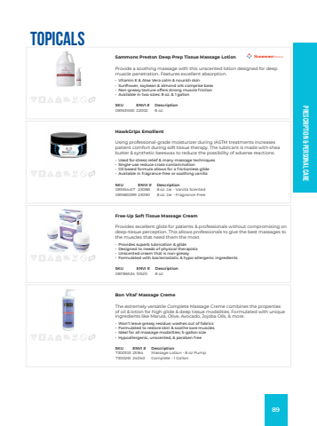 Prescription & Personal CareTopicalsSammons Preston Deep Prep Tissue Massage LotionProvide a soothing massage with this unscented lotion designed for deep muscle penetration. Features excellent absorption.%u2022 Vitamin E & Aloe Vera calm & nourish skin%u2022 Sunflower, soybean & almond oils comprise base%u2022 Non-greasy texture offers strong muscle friction%u2022 Available in two sizes: 8 oz. & 1 gallonSKU ENVI # Description081631530 22002 8 oz.HawkGrips EmollientUsing professional-grade moisturizer during IASTM treatments increases patient comfort during soft tissue therapy. The lubricant is made with shea butter & synthetic beeswax to reduce the possibility of adverse reactions.%u2022 Used for stress relief & many massage techniques%u2022 Single-use reduce cross-contamination%u2022 Oil based formula allows for a frictionless glide%u2022 Available in fragrance-free or soothing vanillaSKU ENVI # Description081654417 23088 8 oz. Jar - Vanilla Scented081680099 23090 8 oz. Jar - Fragrance-FreeFree-Up Soft Tissue Massage CreamProvides excellent glide for patients & professionals without compromising on deep-tissue perception. This allows professionals to give the best massages to the muscles that need them the most.%u2022 Provides superb lubrication & glide%u2022 Designed to needs of physical therapists%u2022 Unscented cream that is non-greasy%u2022 Formulated with bacteriostatic & hypo-allergenic ingredientsSKU ENVI # Description081196534 10520 8 ozBon Vital%u2019 Massage CremeThe extremely versatile Complete Massage Creme combines the properties of oil & lotion for high glide & deep tissue modalities. Formulated with unique ingredients like Marula, Olive, Avocado, Jojoba Oils, & more.%u2022 Won%u2019t leave greasy residue; washes out of fabrics%u2022 Formulated to restore skin & soothe sore muscles%u2022 Ideal for all massage modalities; 5-gallon size%u2022 Hypoallergenic, unscented, & paraben freeSKU ENVI # Description7300103 25164 Massage Lotion - 8 oz Pump7300261 24040 Complete - 1 Gallon89