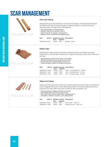 Prescription & Personal CareScar ManagementVisco-Gel TubingDesigned to provide protection to the toes & fingers, these elasticized tubes are fully lined with moisturizing gel to absorb pressure, reduce friction & separate toes or fingers that rub together.%u2022 Fits comfortably in most footwear%u2022 Ribbed materials for greater stretch%u2022 Mesh material for greater compression%u2022 Relieves corns, crooked & overlapping toesSKU ENVI # Billable ItemInternal ModifierDescription081375559 23124 A6457 T087 Ribbed - WideDigital CapsDesigned to reduce shearing forces & absorb shock, the digital caps help relieve pain or discomfort caused from ingrown toenails, corns, hammertoes & toe tips.%u2022 Hypoallergenic & latex-free mesh or knit fabric%u2022 Fits toes or fingers & can easily be cut to size%u2022 Slowly releases a medical grade mineral oil%u2022 Lined with gel to soften & moisturize the skinSKU ENVI # Billable ItemInternal ModifierDescription081280445 10566 A6457 T207 Mesh - Small/Medium - 8 Pack081050137 15213 A6457 T087 Knit - Small/Medium - 6 Pack081050145 15214 A6457 T207 Knit - Large/X-Large - 6 PackSilipos Gel TubingSilipos Gel Tubing is fully lined with medical grade mineral oil gel to provide all around digital protection while absorbing shock. The tubing absorbs shock & pressure & is less bulky than foam tubing & will not bottom out.%u2022 Prevents painful rubbing, irritation, & friction%u2022 Stretchable fabric forms to fingers & toes%u2022 Not made with natural rubber latex, hypoallergenic%u2022 Available in ribbed or narrow, cut to desired sizeSKU ENVI # Billable ItemInternal ModifierDescription081280510 10567 A6457 T087 Mesh Wide - Pack of 1081082221 11568 A6457 T087 Ribbed Narrow - Pack of 292