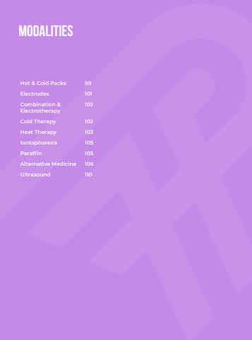 ModalitiesHot & Cold Packs 99Electrodes 101Combination & Electrotherapy102Cold Therapy 102Heat Therapy 103Iontophoresis 105Paraffin 105Alternative Medicine 106Ultrasound 110