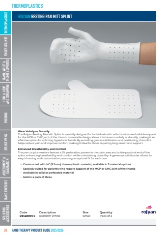 4 HAND THERAPY PRODUCT GUIDE 2025/2026THERMOPLASTICSTHERMOPLASTICS FINGER SPLINTS HAND, WRIST & THUMB SUPPORTS HOOK & LOOP AND STRAPPING PADDING SPLINT PANS ASSESSMENT & EVALUATION HAND EXERCISE SPLINTING ACCESSORIESAs a leader in thermoplastic splinting, Rolyan has established a spectrum of products in partnership with hand and occupational therapists. We recognise that therapists in various fields have different splint-making requirements, and the availability of a broad range of materials across a spectrum of handling and physical characteristics is essential. The development of the Rolyan spectrum not only illustrates the relationship between splinting material families, but it also serves as a tool for clinicians to identify materials that will support their needs. HighHighComformabilityResistanceLowLowTHERMOPLASTICCHARACTERISTICSPolyform%u2122Polyflex II%u2122TailorSplint%u2122Aquaplast%u2122 Aquaplast-T%u2122Watercolors%u2122Ezeform%u2122Synergy%u2122
