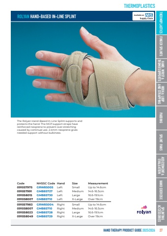 HAND THERAPY PRODUCT GUIDE 2025/2026 7SPLINTING MATERIALS | THERMOPLASTICSTHERMOPLASTICS FINGER SPLINTS HAND, WRIST & THUMB SUPPORTS HOOK & LOOP AND STRAPPING PADDING SPLINT PANS ASSESSMENT & EVALUATION HAND EXERCISE SPLINTING ACCESSORIESCode Thickness Size Perforation Colour Quantity7023396 3.2mm 457 x 610mm Solid Rolyan Blue Individual7023397 3.2mm 457 x 610mm Solid Rolyan Blue Pack of 47023398 3.2mm 457 x 610mm 1% Perf Rolyan Blue Individual7023399 3.2mm 457 x 610mm 1% Perf Rolyan Blue Pack of 4081264084 3.2mm 305 x 457mm Solid White Pack of 4081264118 3.2mm 305 x 457mm 1% Perf White Pack of 4081264134 3.2mm 305 x 457mm Solid White Pack of 6081263599 3.2mm 457 x 610mm Solid White Individual081263615 3.2mm 457 x 610mm 1% Perf White Individual081263847 3.2mm 610 x 914mm Solid White Individual081264050 3.2mm 610 x 914mm Solid White Pack of 4081263623 3.2mm 610 x 914mm 1% Perf White Individual081264076 3.2mm 610 x 914mm 1% Perf White Pack of 4081263714 3.2mm 457 x 610mm Solid Beige Individual081263730 3.2mm 610 x 914mm Solid Beige Individual081263755 3.2mm 610 x 914mm 1% Perf Beige Individual081263854 3.2mm 457 x 610mm Solid Blue Individual081263888 3.2mm 457 x 610mm 1% Perf Blue Individual081263813 3.2mm 610 x 914mm 1% Perf Blue IndividualROLYAN POLYFORM%u2122