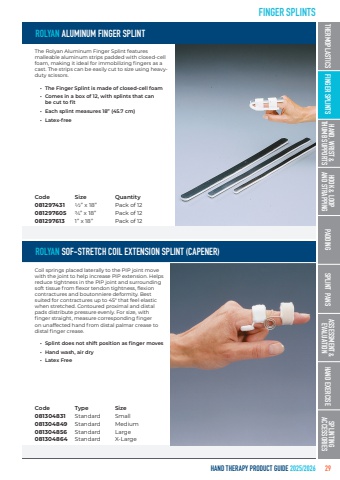 HAND THERAPY PRODUCT GUIDE 2025/2026 9SPLINTING MATERIALS | THERMOPLASTICSTHERMOPLASTICS FINGER SPLINTS HAND, WRIST & THUMB SUPPORTS HOOK & LOOP AND STRAPPING PADDING SPLINT PANS ASSESSMENT & EVALUATION HAND EXERCISE SPLINTING ACCESSORIESCode Thickness Size Perforation Colour Quantity081264266 1.6mm 305 x 457mm Solid White Pack of 4081264282 1.6mm 305 x 457mm 1% Perf White Pack of 4081264290 2.4mm 457 x 610mm Solid White Individual081264324 2.4mm 457 x 610mm 1% Perf White Individual081264027 3.2mm 457 x 610mm Solid White Individual081264241 3.2mm 457 x 610mm Solid White Pack of 4081263607 3.2mm 457 x 610mm 1% Perf White Individual081264068 3.2mm 457 x 610mm 1% Perf White Pack of 4081264001 3.2mm 610 x 914mm 1% Perf White Individual081264035 3.2mm 610 x 914mm Solid White Individual081263631 3.2mm 457 x 610mm Solid Beige Individual081263672 3.2mm 610 x 914mm 1% Perf Beige Individual081263656 3.2mm 610 x 914mm Solid Beige Individual081263698 3.2mm 457 x 610mm 1% Perf Beige Individual081263946 3.2mm 457 x 610mm Solid Blue Individual081263904 3.2mm 610 x 914mm Solid Blue Individual081263920 3.2mm 610 x 914mm 1% Perf Blue Individual081263979 3.2mm 457x610mm 1% Perf Blue IndividualROLYAN POLYFLEX II%u2122