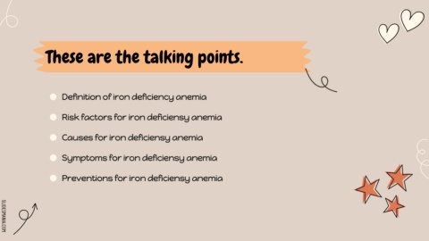 These are the talking points. ⬤ Definition of iron deficiency anemia ⬤ Risk factors for iron deficiensy anemia ⬤ Causes for iron deficiensy anemia ⬤ Symptoms for iron deficiensy anemia ⬤ Preventions for iron deficiensy anemia SLIDESMANIA.COM