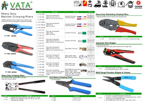 11-160 ¤ Different dies from 6~50 mm², OAL 390 mm, 1.10 kg 11-122A ¤ 0.25~2.5 mm² 11-121 ¤ Crimps 10~22 AWG insulated & non-insulated terminals ,7-8mm
