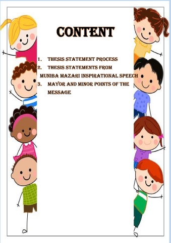 Content 1. THESIS STATEMENT PROCESS 2. THESIS STATEMENTS FROM MUNIBA MAZARI INSPIRATIONAL SPEECH 3. MAYOR AND MINOR POINTS OF THE MESSAGE 2