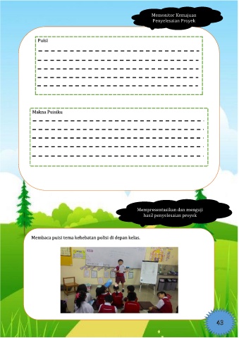 Memonitor Kemajuan Penyelesaian Proyek Puisi Makna Puisiku Mempresentasikan dan menguji hasil penyelesaian proyek Membaca puisi tema kehebatan polisi di depan kelas.