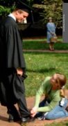 Costumer Kelly Brennan adjusting the hem of actor Jim Caviezel, in the role of famous Georgia golfer Bobby Jones. Transportation Department