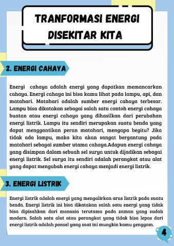 cahaya. Energi cahaya ini bisa kamu lihat pada lampu, api, dan
