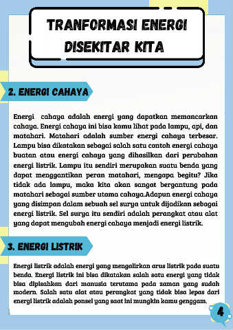 cahaya. Energi cahaya ini bisa kamu lihat pada lampu, api, dan