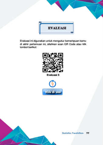 ,, EVALUASI ,, Evaluasi ini digunakan untuk mengukur kemampuan kamu di akhir pertemuan ini, silahkan scan QR Code atau klik tombol berikut: Evaluasi 5 Statistika Pendidikan 99