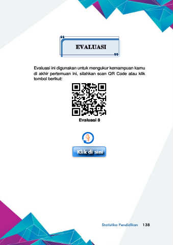 ,, EVALUASI ,, Evaluasi ini digunakan untuk mengukur kemampuan kamu di akhir pertemuan ini, silahkan scan QR Code atau klik tombol berikut: Evaluasi 8 Statistika Pendidikan 138