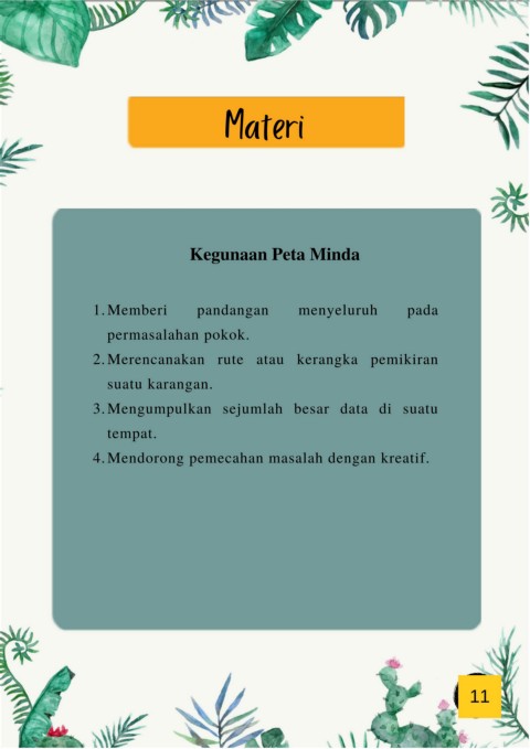 Materi Kegunaan Peta Minda 1. Memberi pandangan menyeluruh pada permasalahan pokok. 2. Merencanakan rute atau kerangka pemikiran suatu karangan. 3. Mengumpulkan sejumlah besar data di suatu tempat. 4. Mendorong pemecahan masalah dengan kreatif. 11