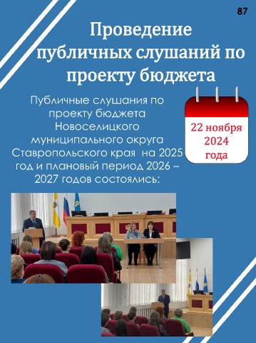 87 Проведение публичных слушаний по проекту бюджета Публичные слушания по проекту бюджета Новоселицкого 22 ноября муниципального округа 2024 Ставропольского края на 2025 года год и плановый период 2026 – 2027 годов состоялись: