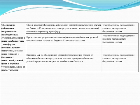 Обеспечение Сбор и анализ информации о соблюдении условий предоставления средств Уполномоченное подразделение