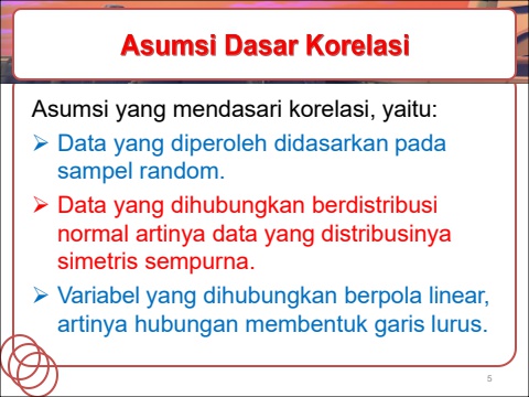 Asumsi yang mendasari korelasi, yaitu:%uf0d8 Data yang diperoleh didasarkanpadasampel random. %uf0d8 Data yang dihubungkanberdistribusinormal artinya data yangdistribusinyasimetris sempurna. %uf0d8 Variabel yang dihubungkanberpolalinear,artinya hubungan membentukgarislurus.5