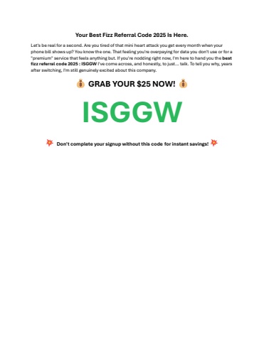 Your Best Fizz Referral Code 2025 Is Here.Let's be real for a second. Are you tired of that mini heart attack you get every month when your phone bill shows up? You know the one. That feeling you're overpaying for data you don't use or for a \ service that feels anything but. If you're nodding right now, I'm here to hand you thebest fizz referral code 2025: ISGGWI've come across, and honestly, to just... talk. To tell you why, years after switching, I'm still genuinely excited about this company. GRAB YOUR $25 NOW! ISGGW Don't complete your signup without this codeforinstant savings!