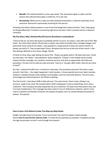 %u2022Benefit:The referral benefit is a two-way street. The new person gets a credit, and the person who referred them gets a credit too. It%u2019s a win-win.%u2022Exclusivity:While promo codes are often blasted everywhere, a referral code feels more personal. Someone is personally vouching for the service.Honestly, the whole referral system is one of the first things that made me think, \do things differently.\m company.My Fizz Story: Why I Ditched My Old Carrier (And Never Looked Back)I have to tell you my story because it's probably similar to yours. For years, I was with one of the \Guys.\plans that never quite fit my needs. I was paying fora huge bucket of data, but some months I'd barely use half of it. That unused data? Gone. Vanished into thin air at the end of the month. It felt like setting a $20 bill on fire. Every. Single. Month.A friend of mine, Alex, kept telling me about Fizz. \ild my own plan. It's cheap.\means terrible coverage, non-existent customer service,and dial-up speed data. But Alex was persistent. He sent me his referral code and said, \ve to lose?\So I did. I ordered the SIM card. It arrived in a few days. The activation process? All online, super smooth. And then... the magic happened. I built my plan. I chose exactly how much data I wanted, whether I needed Canadawide calling or just Quebec, and my voicemail options. The price was... shockingly low. And transparent. No hidden anything.The first month, I had about 2GB of data left over. The next month, there it was, sitting in my account, ready to be used. My unused data! It didn't disappear! It was a small thing, but it was a revelation. This company actually respected me as a customer.It's been over three years now, and I've never looked back. The coverage has been solid (it runs on Videotron's network, which is topnotch in Quebec and Eastern Ontario), the speeds are great, and I've saved literally thousands of dollars. Thousands.How to Use a Fizz Referral Code: The Step-by-Step GuideAlright, let's get down to business. You're convinced. You want the sweet, sweet savings. Here%u2019show to use the fizz referral code. I%u2019ll make this as painless as possible. It happens during the sign-up process, so don't rush through the screens!