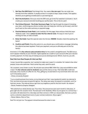 1.Get Your Fizz SIM Card:First thing's first. You need afizz sim card. You can order one directly from their website. It usually arrives in a couple of days. Super simple. This applies whether you're getting a mobile plan or just starting out.2.Start the Activation:Once you have the SIM card, go to the Fizz website to activate it. You'll create your account and start building your perfect plan. This is the fun part!3.The Critical Moment -The Order Summary Page:You'll go through the steps of choosing your plan, confirming your phone number (you can keep your old one, by the way!), and then you'll land on the order summary or payment page.4.Find the Referral Code Field:Look carefully! On this page, there will be a field that says \ code\clicking too fast, so take a breath.5.Enter the Code:Type this special code into the box:ISGGW. Double-check the spelling. No typos!6.Confirm and Finish:Once the code is in, you should see a confirmation message indicating the referral has been applied. Finish your payment, and you're officially part of the Fizz family!And that's it! Thefizz referral code activation timefor the credit is straightforward. The $25 bonus won't appear instantly on your first bill. It gets applied as a credit on your account after your second monthly payment. It's their way of making sure you're sticking around. Which, trust me, you will.Real Talk from Real People (It's Not Just Me!)I know I sound like a superfan, but I wanted to make sure I wasn't in a bubble. So I asked a few other people I know who switched. Here%u2019s what they said, word for word.\ a student, every dollar counts. My old plan was almost $60. With Fizz, I pay around $35 for what I need. Thefizz referral code for studentswas just the cherry on top. That initial $25 credit was basically a free month of coffee for me. Plus, gifting my unused data to my roommate when she runs out? A friendship saver.\Chlo%u00e9, University Student\ run a small business from home, so my internet can't fail. I was hesitant to switch my internet to Fizz, but their prices were too good to ignore. The setup was easy, the speed is consistent, and I've had zero issues. The referral bonus I got from my neighbour paid for the first month. No-brainer.\-David, Freelance Graphic Designer\ switched our whole family over. Four lines. The amount we save each month is ridiculous. It goes right into the vacation fund. The best part is the flexibility. When my son goes on a school trip, I can add a US-data block for a few days and then removeit. With our old provider, that was a phone call to a retention department and a 3-year contract extension. Never again.\-Marie-H%u00e9l%u00e8ne, Mom of TwoSee? It's not just me. The appeal is broad because the value is real.