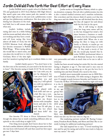 Jordin’s most memorable moment was in 2008 Divi- sion 4 Finals in Kennedale, TX while racing jr. dragsters. She won 15 straight rounds between Saturday and Sunday’s race. “I won the All Run 330 bracket race Saturday night and made ittothefi-