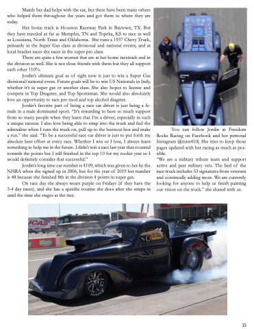 You can follow Jordin at Freedom Rocks Racing on Facebook and her personal Instagram @miss410j. She tries to keep those pages updated with her racing as much as pos- sible.