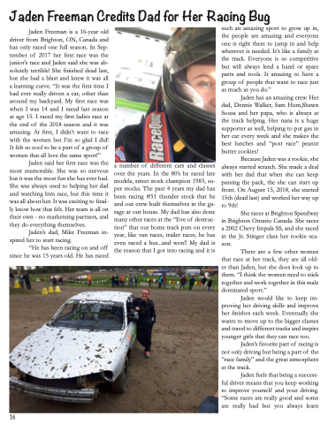 Jaden Freeman is a 16-year old driver from Brighton, ON, Canada and has only raced one full season. In Sep- tember of 2017 her first race was the junior’s race and Jaden said she was ab- solutely terrible! She finished dead last, but she had a blast and knew it was all a learning curve. “It was the first time I had ever really driven a car, other than around my backyard. My first race was when I was 14 and I raced last season at age 15. I raced my first ladies race at the end of the 2018 season and it was amazing. At first, I didn’t want to race with the women but I’m so glad I did! It felt so cool to be a part of a group of women that all love the same sport!”