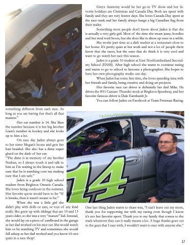 Jaden is a grade 10 student at East Northumberland Second- ary School (ENSS). After high school she wants to continue racing and wants to go to school to become a photographer. She hopes to have her own photography studio one day.