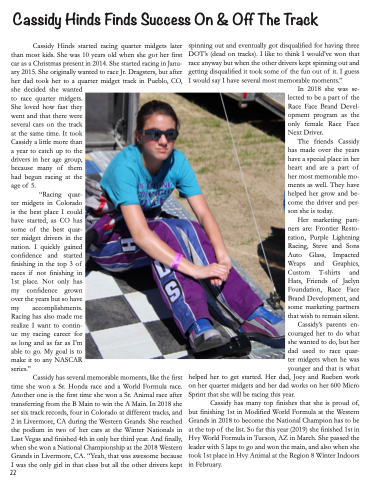 Cassidy Hinds started racing quarter midgets later than most kids. She was 10 years old when she got her first car as a Christmas present in 2014. She started racing in Janu- ary 2015. She originally wanted to race Jr. Dragsters, but after her dad took her to a quarter midget track in Pueblo, CO, she decided she wanted