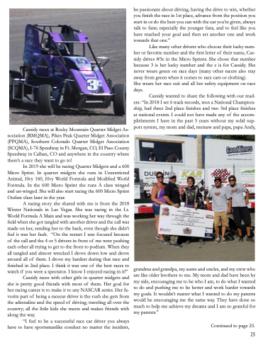 Cassidy races with other girls in quarter midgets and she is pretty good friends with most of them. Her goal for her racing career is to make it to any NASCAR series. Her fa- vorite part of being a racecar driver is the rush she gets from the adrenaline and the speed of driving; traveling all over the country; all the little kids she meets and makes friends with along the way.