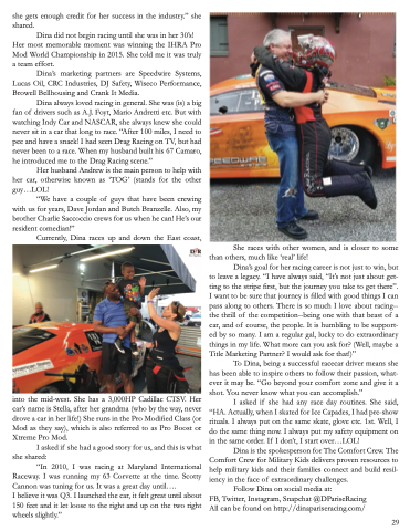 Dina’s goal for her racing career is not just to win, but to leave a legacy. “I have always said, “It’s not just about get- ting to the stripe first, but the journey you take to get there”. I want to be sure that journey is filled with good things I can pass along to others. There is so much I love about racing-- the thrill of the competition--being one with that beast of a car, and of course, the people. It is humbling to be support- ed by so many. I am a regular gal, lucky to do extraordinary things in my life. What more can you ask for? (Well, maybe a Title Marketing Partner? I would ask for that!)”