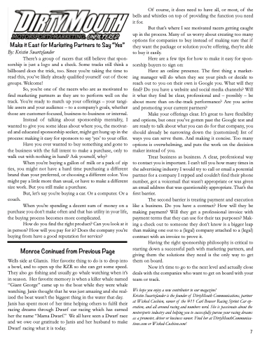 There’s a group of racers that still believe that spon- sorship is just a logo and a check. Some tracks still think a billboard does the trick, too. Since you’re taking the time to read this, you’ve likely already qualified yourself out of those groups. Welcome!
