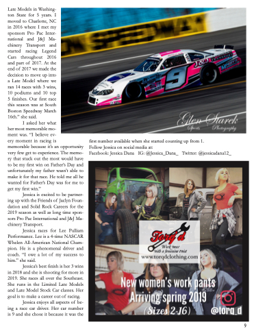 Late Models in Washing- ton State for 5 years. I moved to Charlotte, NC in 2016 where I met my sponsors Pro Pac Inter- national and J&J Ma- chinery Transport and started racing Legend Cars throughout 2016 and part of 2017. At the end of 2017 we made the decision to move up into a Late Model where we ran 14 races with 3 wins, 10 podiums and 10 top 5 finishes. Our first race this season was at South Boston Speedway March 16th.” she said.