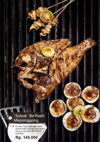 ‘ Subak ‘ Be Pasih Mepanggang Grilled fish, calamari and clams with Subak specialty sauce, served with mixed sambal Rp. 145.000