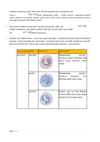menjadi 2 yaitu granulosit dan agranulosit. Granulosit terdiri dari eosinofil, basofil dan neutrofil.