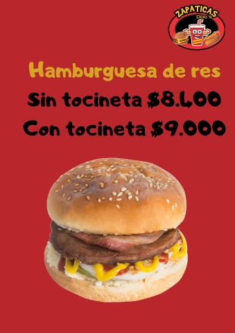 Hamburguesa de res Sin tocineta $8.400 Con tocineta $9.000