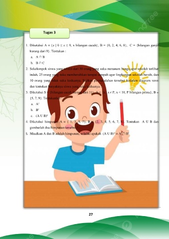3. Diketahui S = {bilangan cacah kurang dari 11}, A = {x | x є P, x < 10, P bilangan prima}, B =