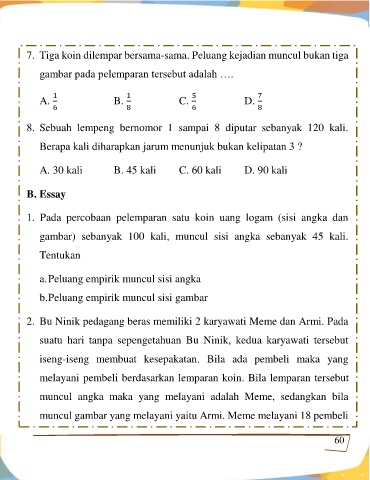 7. Tiga koin dilempar bersama-sama. Peluang kejadian muncul bukan tiga