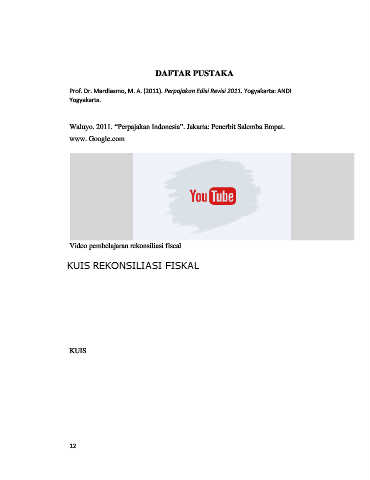 DAFTAR PUSTAKA Prof. Dr. Mardiasmo, M. A. (2011). Perpajakan Edisi Revisi 2011. Yogyakarta: ANDI Yogyakarta. Waluyo. 2011. “Perpajakan Indonesia”. Jakarta: Penerbit Salemba Empat. www. Google.com Video pembelajaran rekonsiliasi fiscal KUIS 12