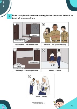 a. Now, complete the sentence using beside, between, behind, in front of, or across from. Worksheet 3.6 75