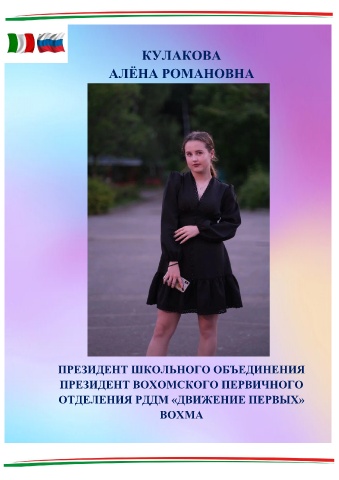 КУЛАКОВА АЛЁНА РОМАНОВНА ПРЕЗИДЕНТ ШКОЛЬНОГО ОБЪЕДИНЕНИЯ ПРЕЗИДЕНТ ВОХОМСКОГО ПЕРВИЧНОГО ОТДЕЛЕНИЯ РДДМ «ДВИЖЕНИЕ ПЕРВЫХ» ВОХМА